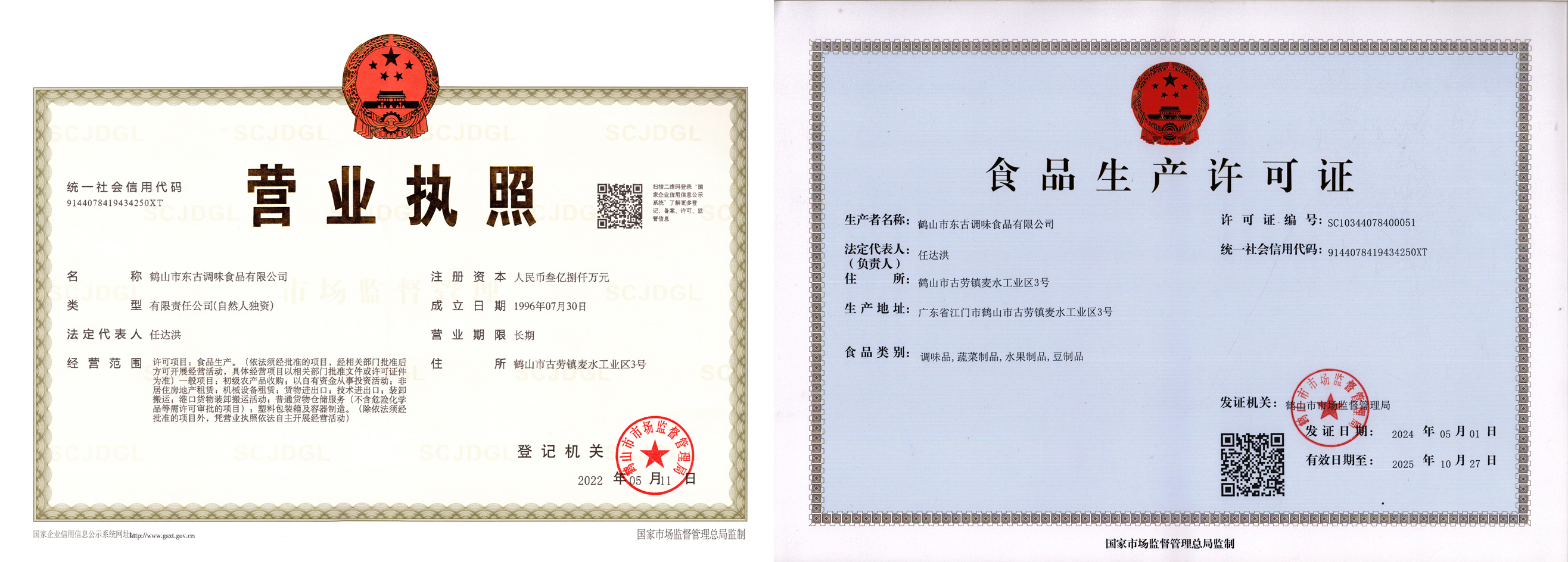 鶴山市東古調味食品有限公司現位于廣東省鶴山市古勞鎮麥水工業區3號,前身為始創于清>朝道光三十年(公元一八五〇年)的調珍醬園,原設在鶴山縣古勞鎮古勞墟,迄今已有一百六十多年歷史。